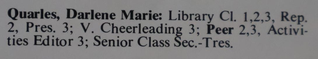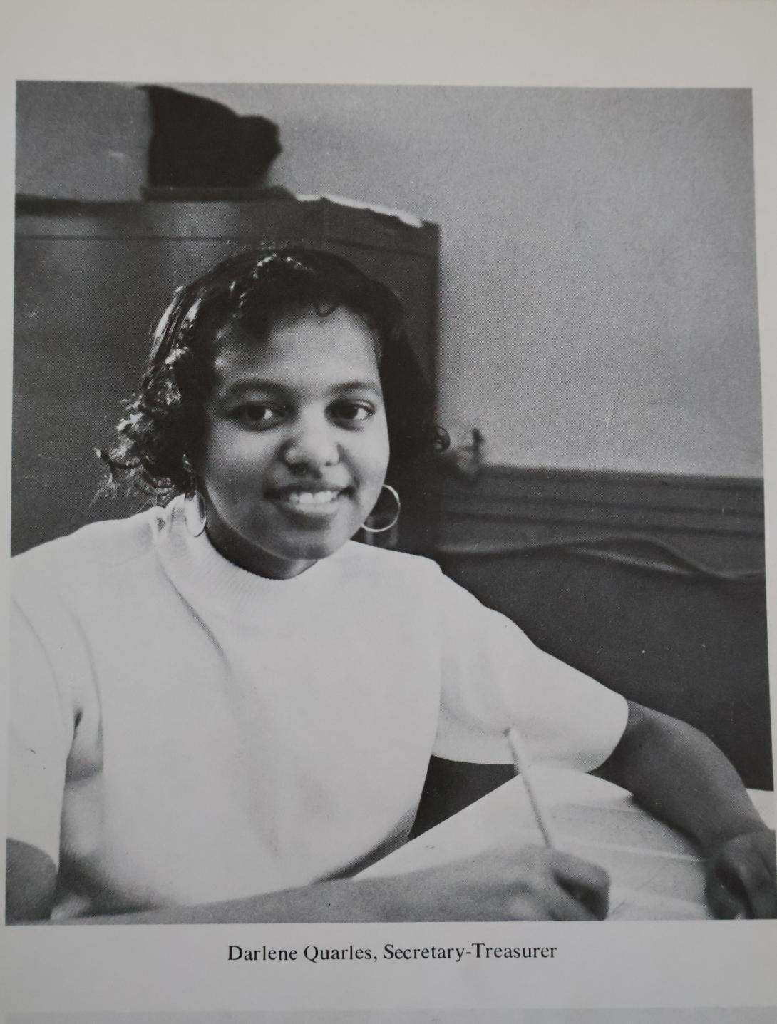 Born in 1952 in Cobham, Virginia, Darlene Quarles (Robinson) attended county schools in a segregated setting. As a Black child, she was bussed to Rose Hill Elementary School in Charlottesville through sixth grade, passing the local white school on the way. When schools integrated, she attended Stone Robinson Elementary and then Jack Jouett Junior High School before going to Albemarle High School in the 10th grade. About Albemarle, she said: “It was a big school. To me, it was a big school. A lot more white people. As I said, I was on the college track, so I was, with the exception of the Black history class, most of the classes I might have been one of two, maybe one of three Black people in the class.” A very serious student, she reflected that “school was my social activity.” She was one of the first two Black cheerleaders at Albemarle, having good memories of that experience. In addition, she participated in school activities as a member of Yearbook staff, president of library club, and secretary/treasurer of the senior class. Darlene attended Virginia Tech for college, where she was on the Drill Team and performed at football games during halftime. A double major in both Spanish and history, she built her professional career as a high school teacher of Spanish, retiring from the Fairfax County school system in 2009.